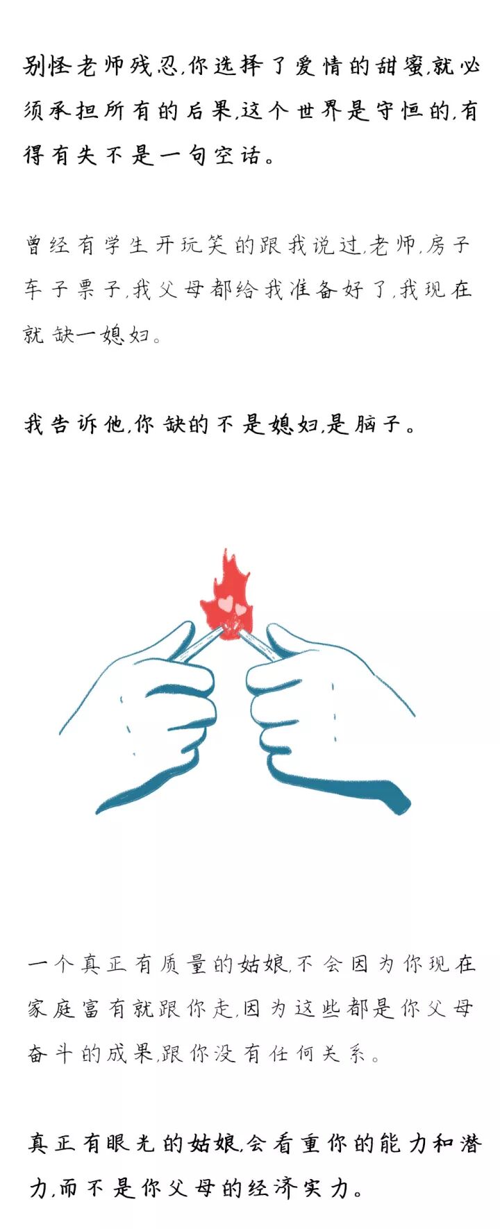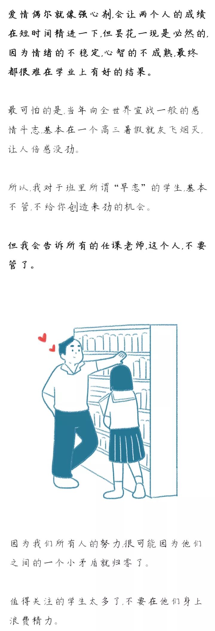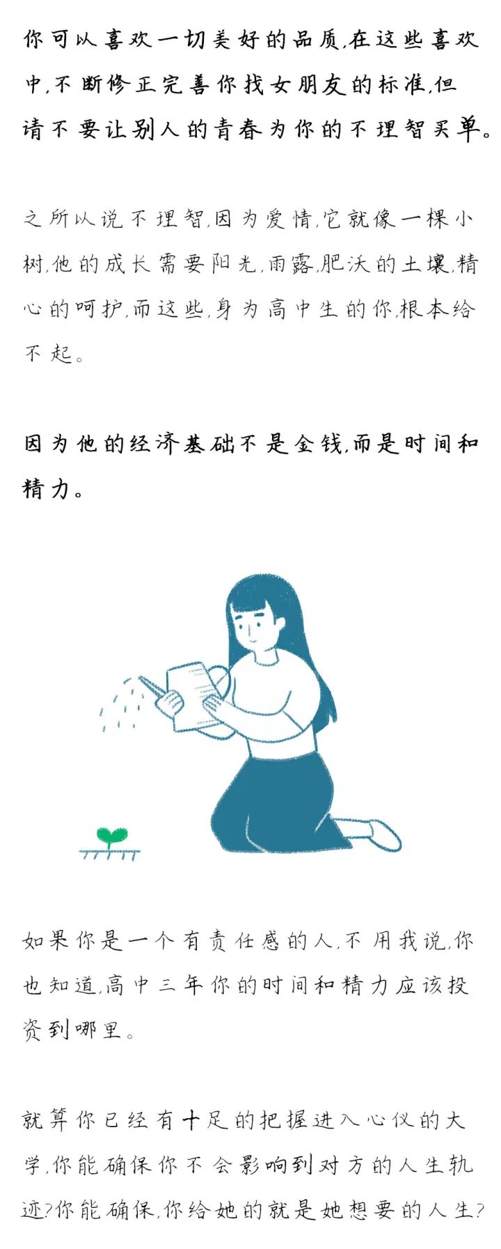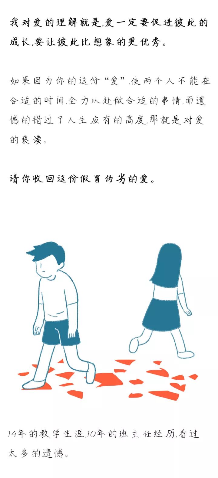 就如文中的班主任说的:如果这份“爱”使两个人不能在合适的时间,全力以赴做合适的事情,而遗憾的错过了人生应有的高度。真正的爱是要促进彼此的成长,要让彼此比想象的更优秀。